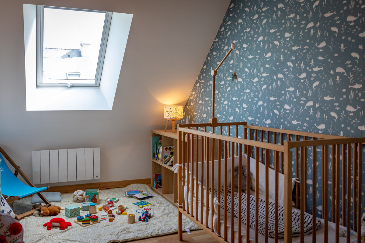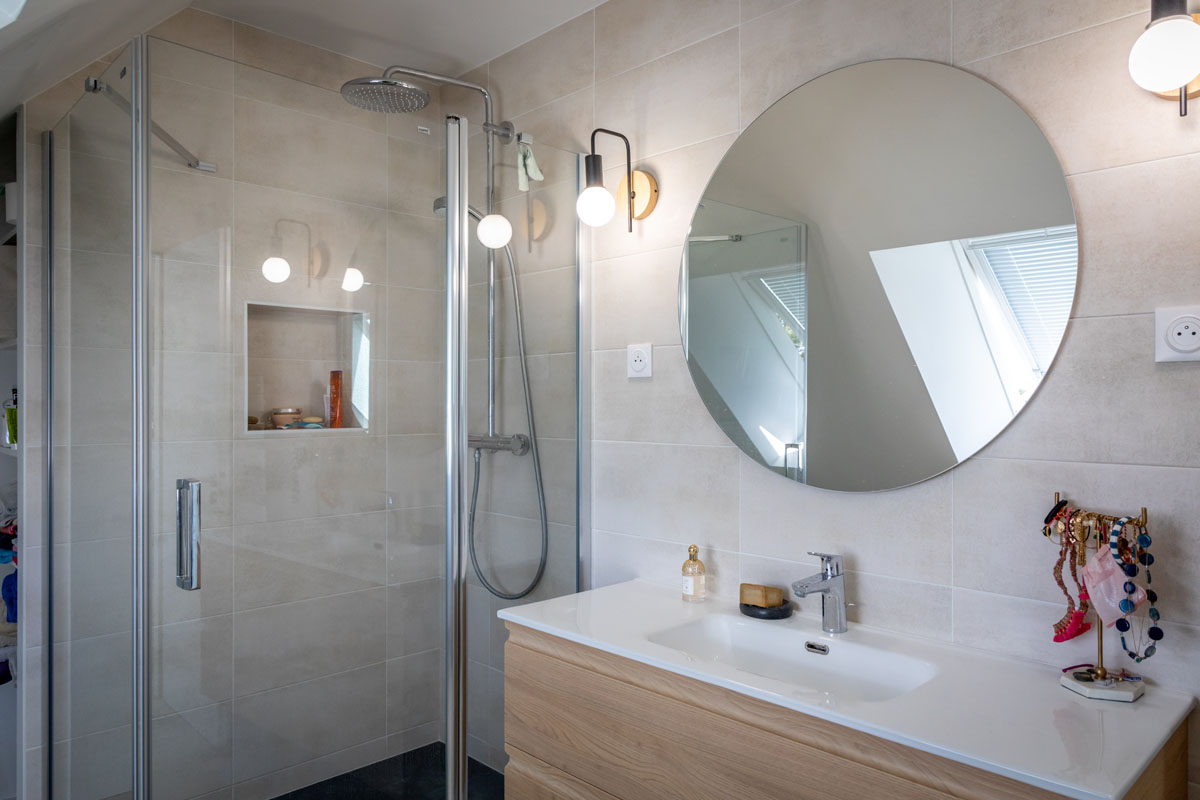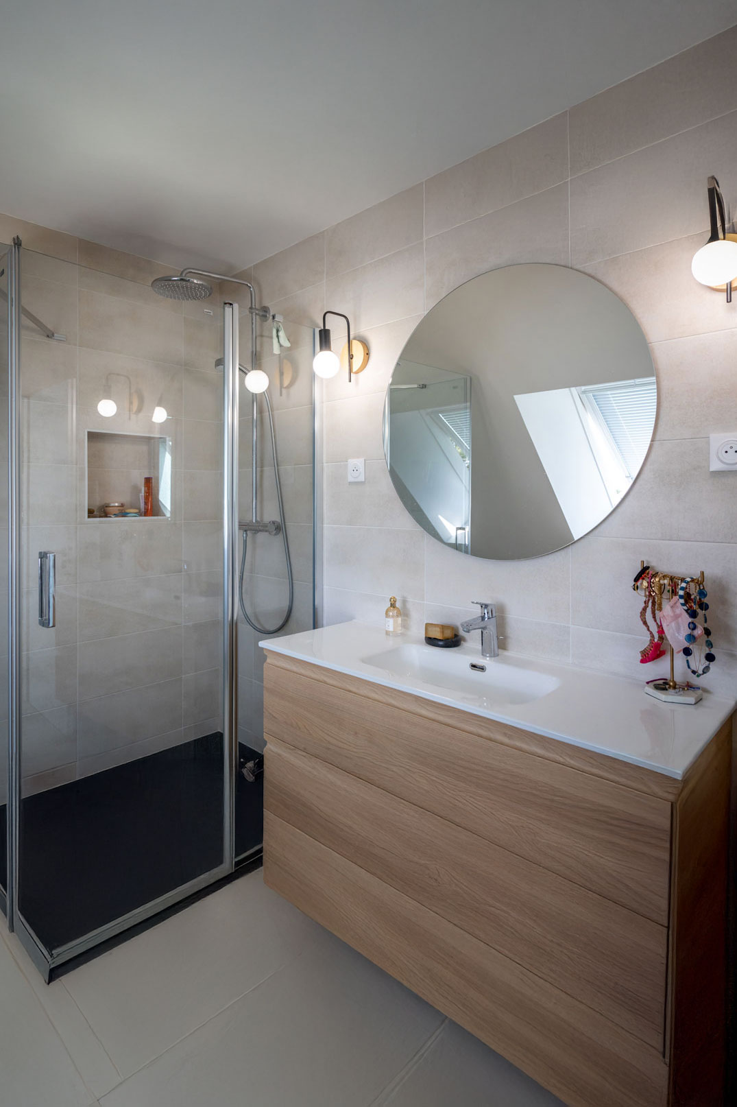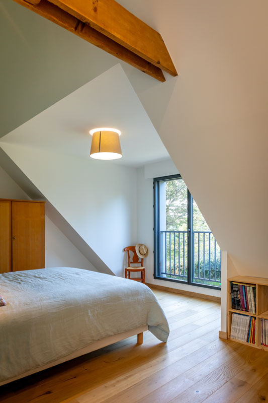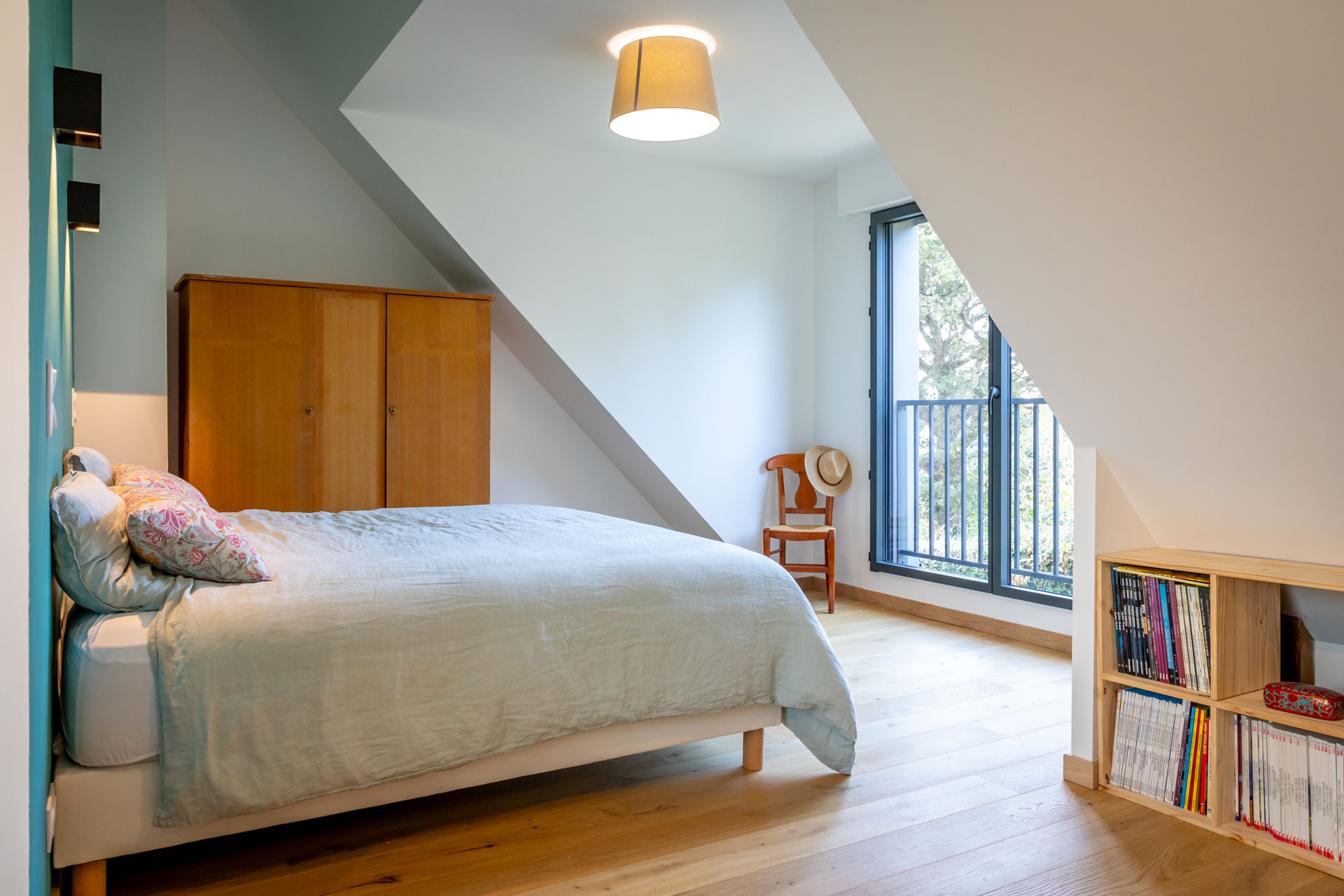 Ici, la création d’une lucarne a fait toute la différence : elle apporte verticalité et caractère à la façade, tout en permettant d’aménager une chambre parentale dans les combles. Ainsi, un espace jusque-là perdu sous les toits s’est métamorphosé en un cocon lumineux, grâce à une grande baie ouvrant sur le jardin. Une salle d’eau attenante complète cet espace paisible et fonctionnel.